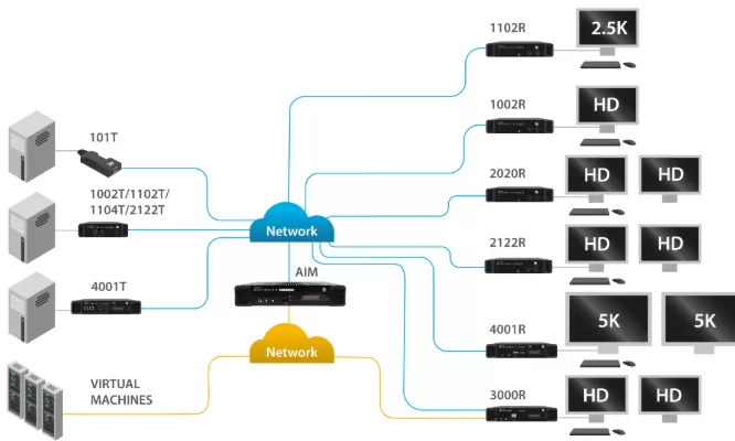 Phân phối tín hiệu đến các màn hình, workstation, hoặc người dùng khác nhau một cách linh hoạt (thông qua Video Controller / KVM Controller).