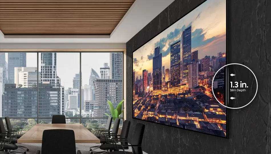 Thiết kế mỏng chỉ 34,1 mm, cùng viền siêu mảnh ba cạnh giúp tối ưu không gian và tạo cảm giác sang trọng. Người dùng có thể xoay ngang hoặc dọc tùy theo nhu cầu trình chiếu, mang lại sự linh hoạt cao trong lắp đặt.